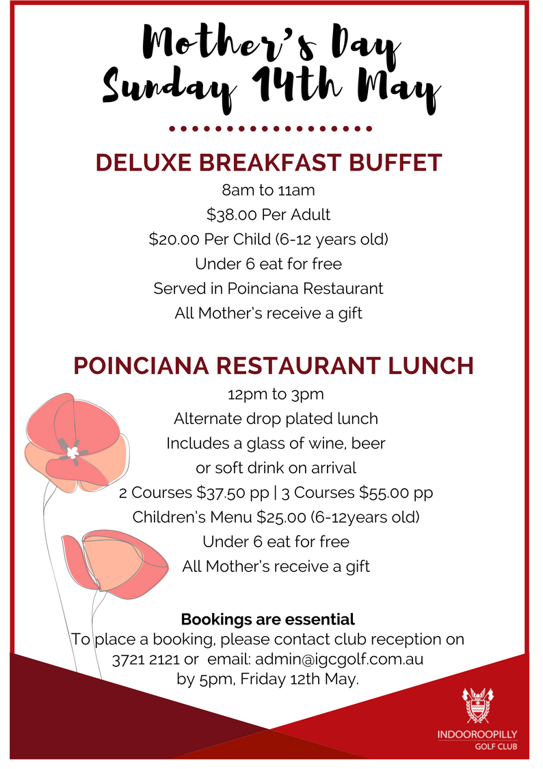 Celebrate Mothers Day at Indooroopilly Golf Club with our Deluxe Breakfast Buffet or Plated Lunch.
