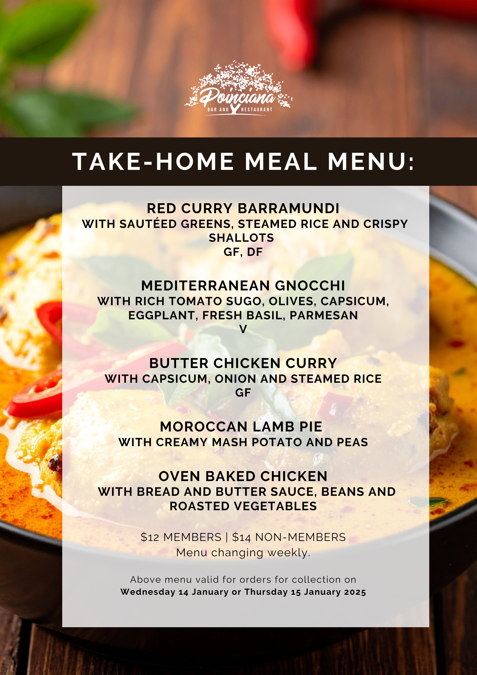 Take-home meal orders for collection on Wednesday 14 January or Thursday 15 January will be opening at 12:00pm, Friday 9 January.